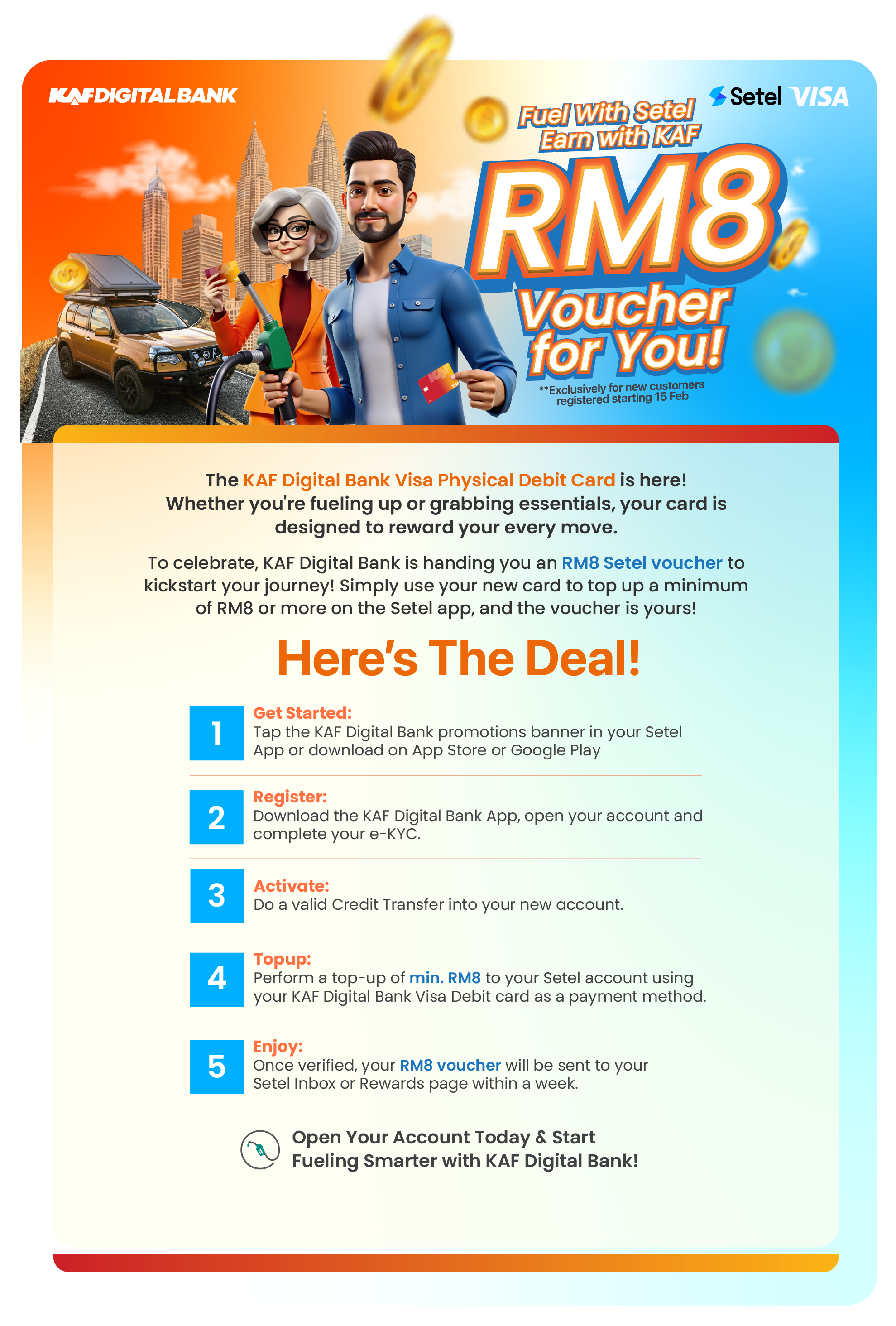 Download the KAF DB app, activate a Savings Account-i, and perform one successful minimum top-up of RM8.00 to your Setel e-wallet using your KAF DB Debit Card-i. Ensure both apps use the same phone number.